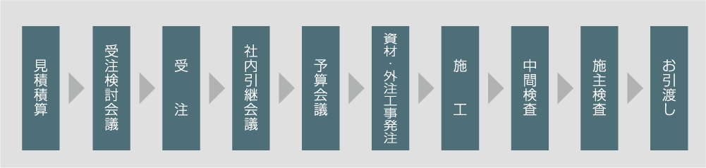 見積積算からお引渡しまでの間、営業や技術、業務管理など数多くの社員やスタッフが連携を重ね、総力をあげて取り組んでいます。